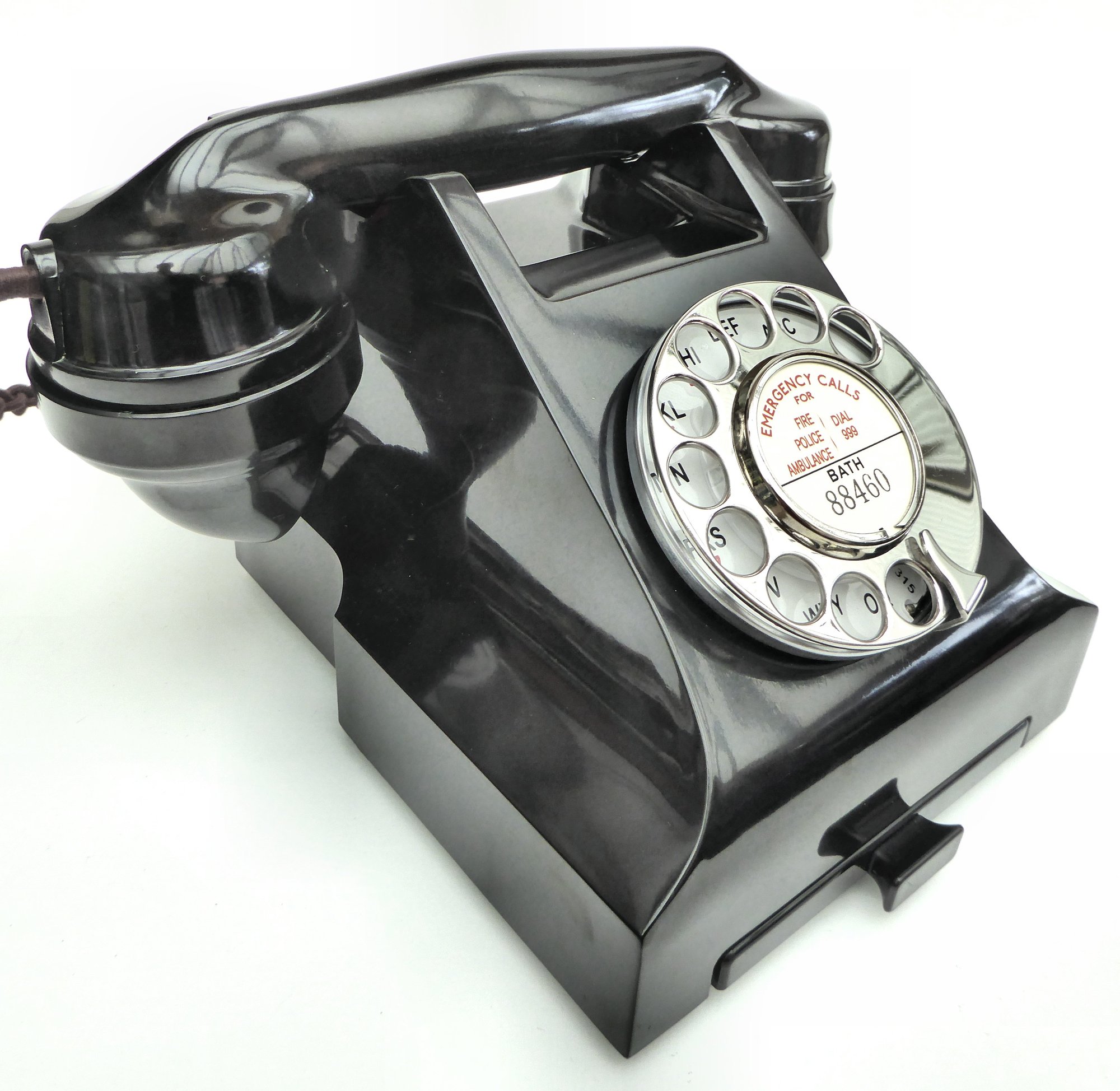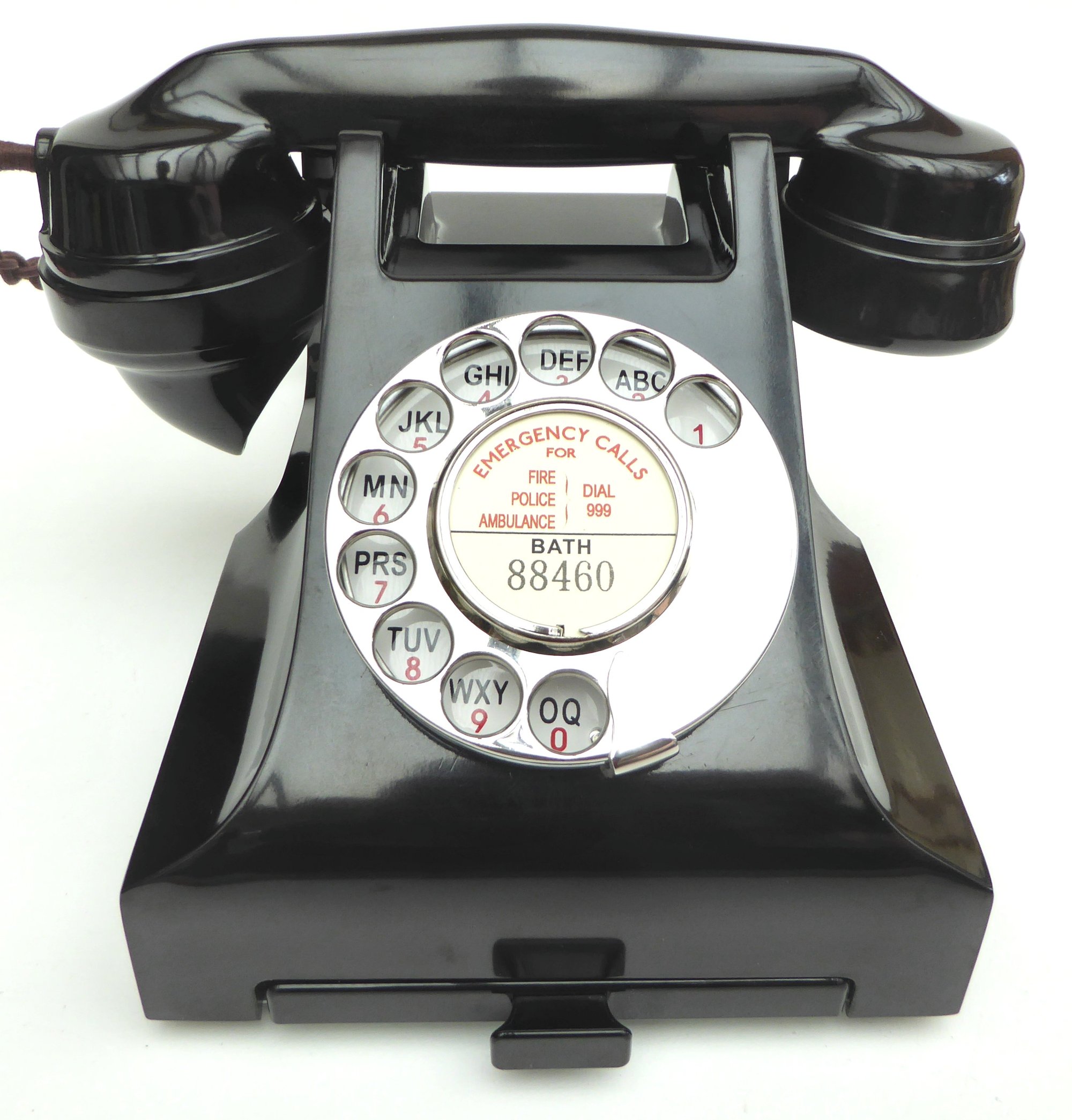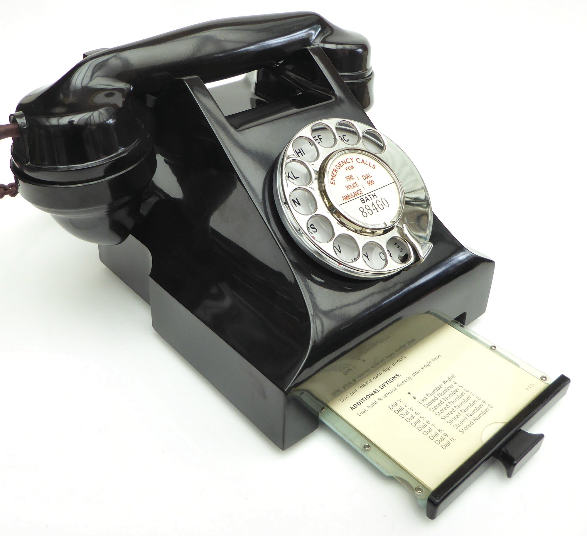 The telephone comes complete with our own high quality reproduction paper furniture. The dial label can be customised with an area and telephone number of your choice.