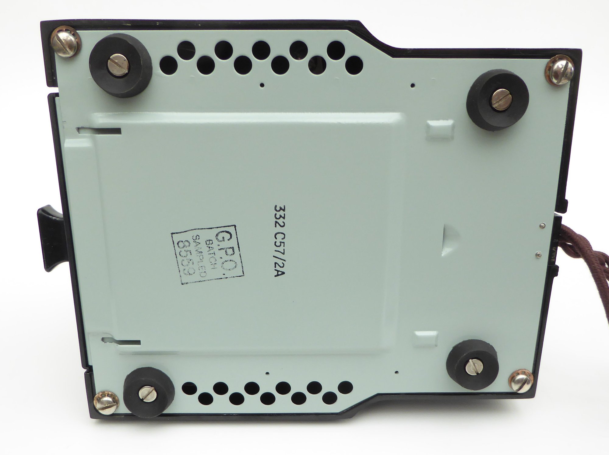 This is a nice example of a British Bakelite 332 introduced as the 'Combined Microtelephone'. The handset is dated 1957 (164/57). It is in first class working order and the case has a nice sheen. The dial is fully serviced No.10 with an alphanumeric dial plate. All cords have been replaced with our own, UK manufactured, pure Egyptian cotton braided cords correctly terminated with cotton ties.