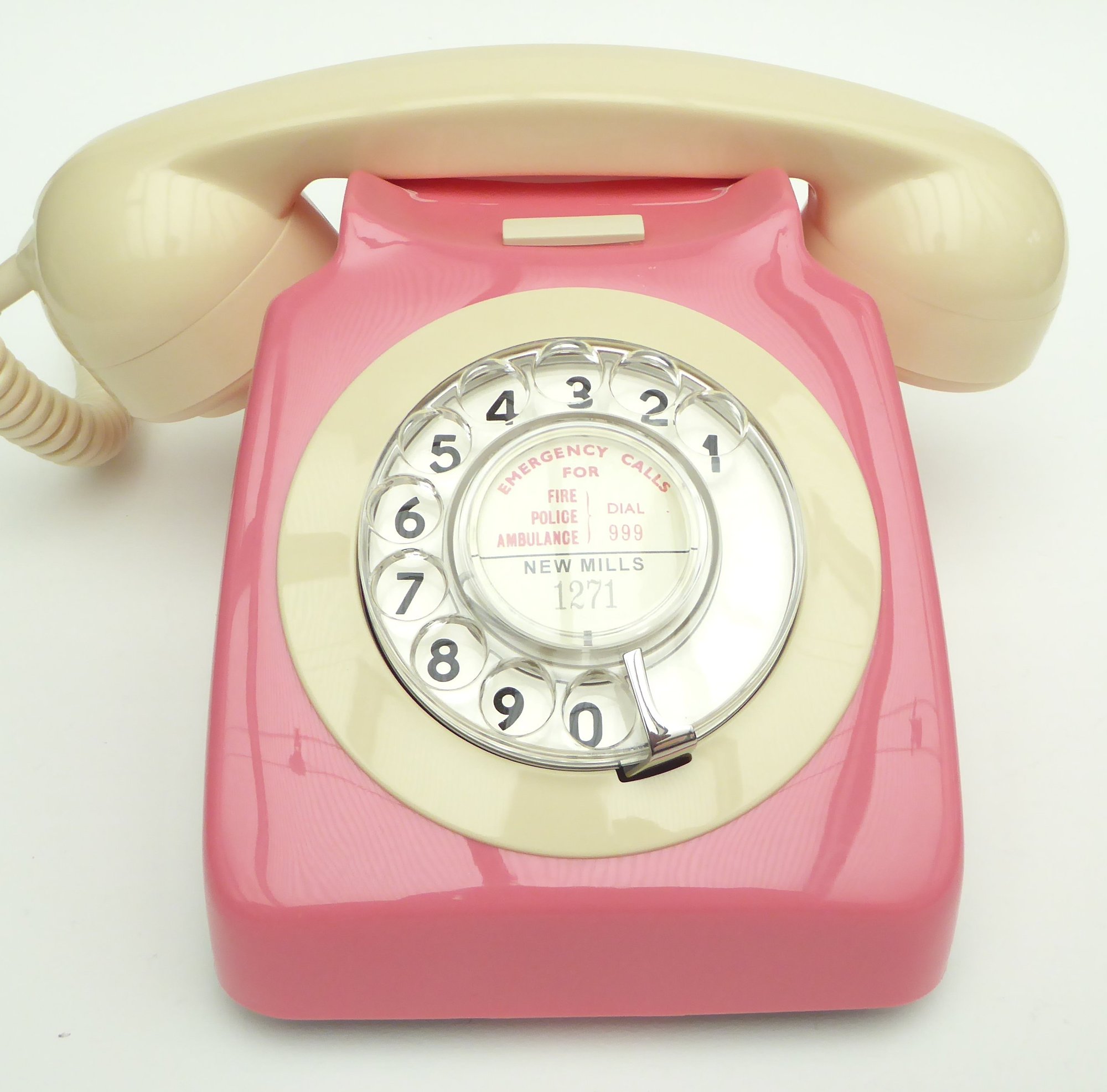 A classic British 746 series telephone recased in a contemporary Pink and Ivory, in first class working order and ready to plug in and use. A modern twist on an old classic. Of course it has the quintessential twin bell 'ring ring', a No.21 numeric dial and a replacement transmitter unit for high quality speech. It also comes complete with our own reproduction paper furniture on which we can print your exchange and telephone number.