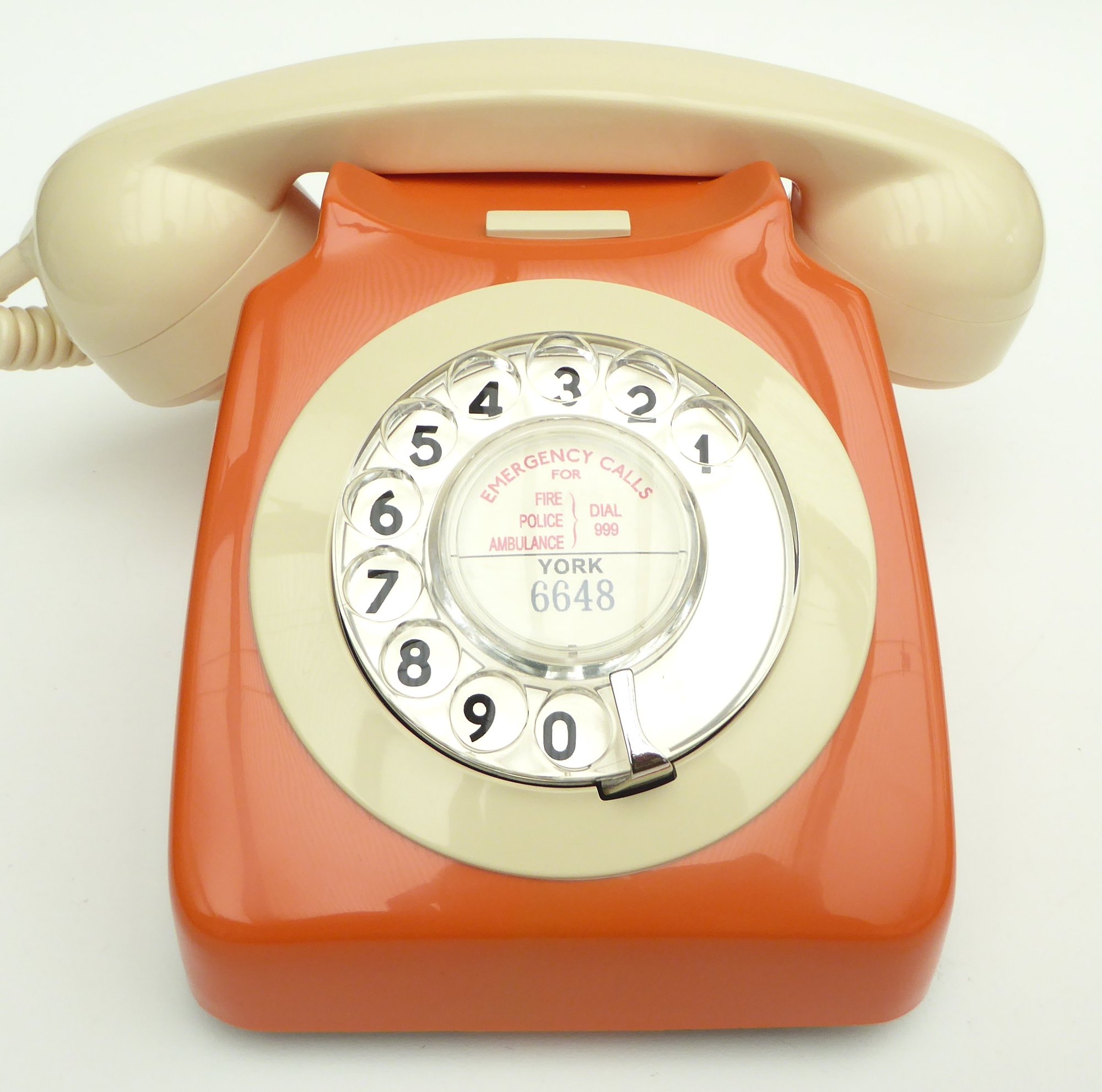 A classic British 746 series telephone recased in a contemporary Orange and Ivory, in first class working order and ready to plug in and use. A modern twist on an old classic. Of course it has the quintessential twin bell 'ring ring', a No.21 numeric dial and a replacement transmitter unit for high quality speech. It also comes complete with our own reproduction paper furniture on which we can print your exchange and telephone number.